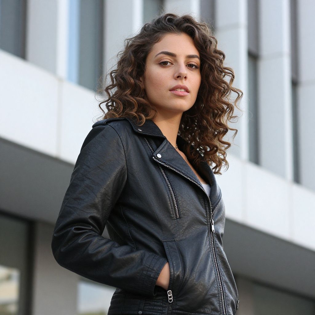 Woman with faux hawk with a soft wave hairstyle standing in a sunlit city park, wearing a denim jacket and wearing expressive eyes, natural sunlight casting gentle shadows, detailed realism, vibrant colors, medium shot, cinematic lighting, urban atmosphere.