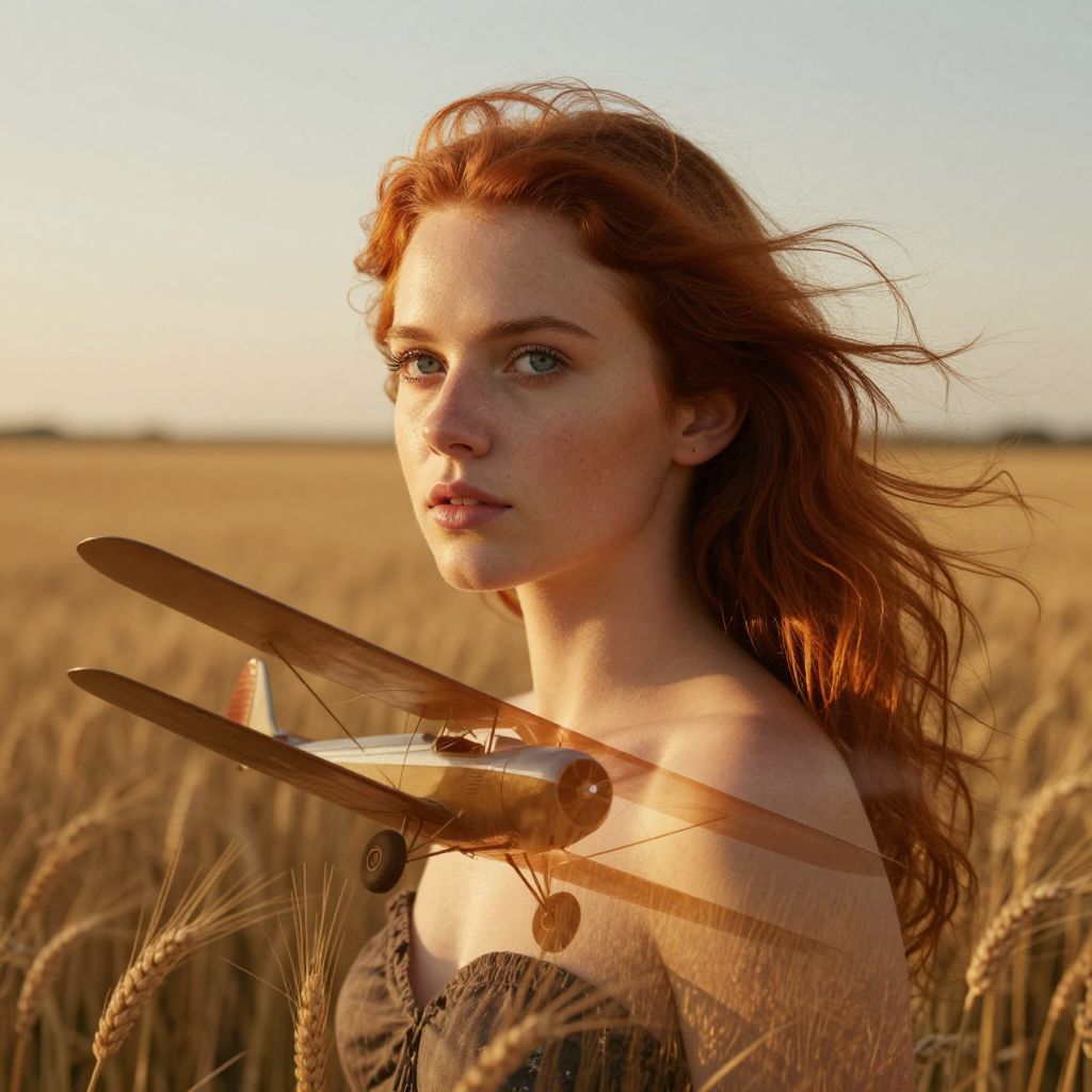A captivating portrait of a young woman with intense blue eyes and sun-kissed skin, her fiery red hair flowing gracefully in the breeze. She stands amidst an endless field of golden wheat, gently swaying under the warm glow of sunset. The soft contours of her face contrast sharply with the bold lines of a vintage airplane silhouette overlaying her form, its wings stretching towards the horizon as if she were soaring through the skies. From this elevated perspective, we observe her serene yet resolute expression, where the airplane's metallic surface seamlessly blends with her skin in an ethereal interplay of light and shadow. This mesmerizing double exposure portrait captures both the fragility and resilience of the human spirit amidst nature's vast expanse.