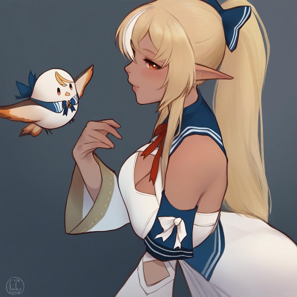 Digital artwork of a dark-skinned female elf character with long blonde and white streaked hair tied in a high ponytail with a blue bow. She has red-orange eyes and wears a white dress with detached long sleeves featuring blue and white sailor-style accents and a red necktie. A small bird with similar blue and white sailor-themed ribbons is flying near her hand. The character has large breasts and bare shoulders, set against a plain dark background.