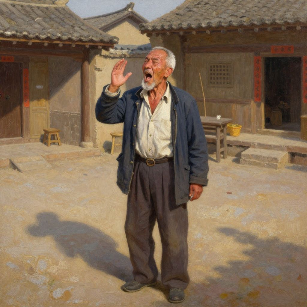 Photograph of an elderly Asian man with a gray beard and short-cropped hair, standing in a traditional, rustic courtyard. He wears a blue jacket over a white, slightly wrinkled shirt, and dark trousers, with black shoes. His right hand is raised in a gesturing motion, and he appears to be speaking or shouting. The background features two wooden buildings with tiled roofs, red accents, and simple wooden furniture, including a small stool and a table. The ground is dirt, and sunlight casts shadows, adding warmth and depth to the image. The man's expression is animated, suggesting he is engaged in a lively conversation.