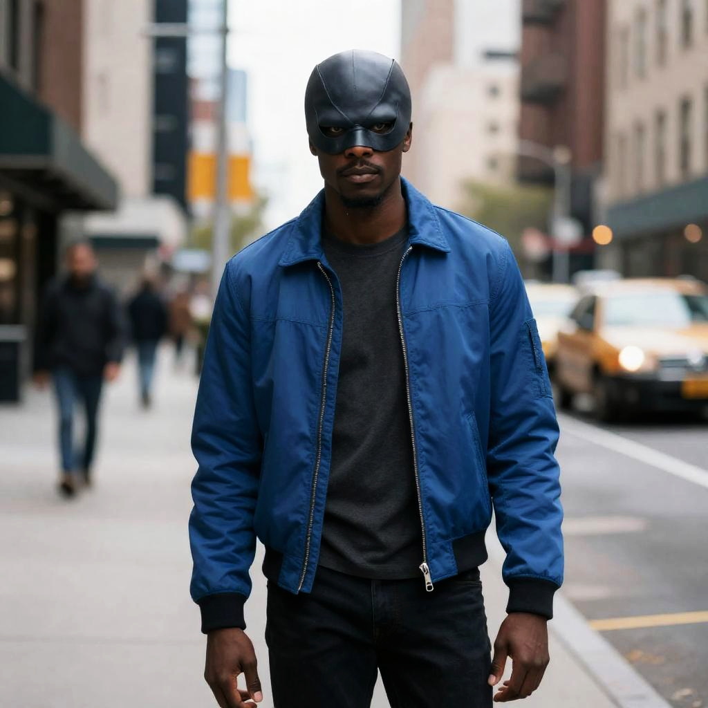 A young African American man wearing a black mask and a blue bomber jacket stands confidently on a busy urban street. The background shows blurred pedestrians and a yellow taxi, suggesting a lively city environment.
