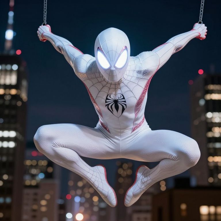 White spider suit worn by agile hero swinging through nighttime cityscape, glowing white eyes, aerodynamic design with smooth white and silver textures, action-packed composition