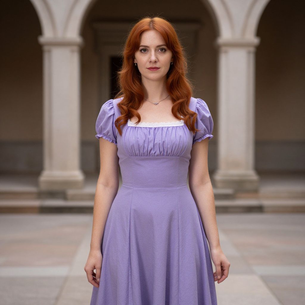 Redhead Costume, woman with red hair and a purple dress in a courtyard