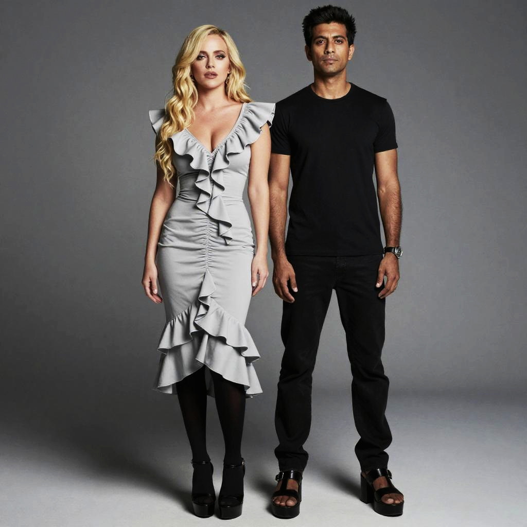 4k, UHD, absurdres, hyperrealistic modelshoot style photograph by diane arbus[ Rita Ora|Archie Panjabi] wearing { leather harness, goggles, and cargo pants | denim jacket, striped shirt, and white sneakers | midi dress with ruffles, black tights, and platform sandals | pair of overalls with a ruffled or lace-trimmed blouse, and a pair of ankle boots or clogs }, Lubitel 2, masterpiece, award winning photography, lighting, perfect composition, high detail, hyper realistic, dramatic lighting, epic, short depth of field