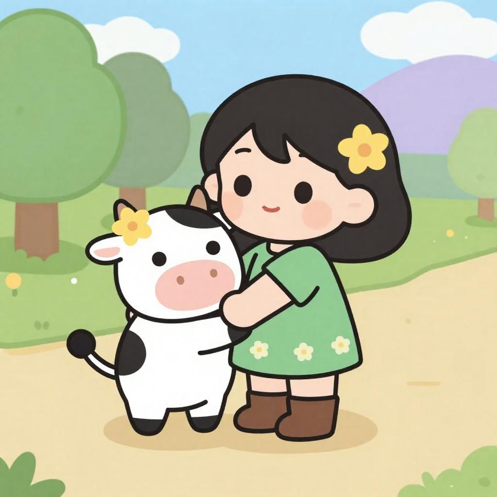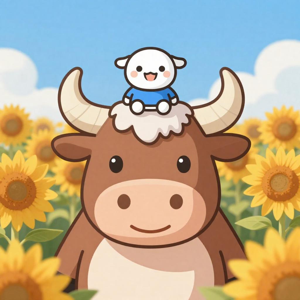 A digital illustration of a smiling cartoon bull with large white horns, standing in a sunflower field. A cheerful, small, blue-shirted character sits atop the bull's head. Bright blue sky and tall sunflowers fill the background. The bull's face is close to the viewer, emphasizing its friendly expression.