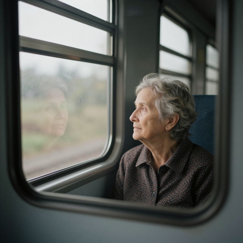 Photograph of an elderly woman with short, gray, wavy hair, wearing a dark brown, polka-dotted coat, gazing out of a train window. The window frames her profile, showing her contemplative expression. The background outside the window is blurred, featuring green and beige hues, indicating a rural landscape. Inside the train, the walls are dark gray with a matte texture. The light from the window illuminates her face, highlighting her wrinkles and thoughtful demeanor. The image captures a moment of quiet reflection.