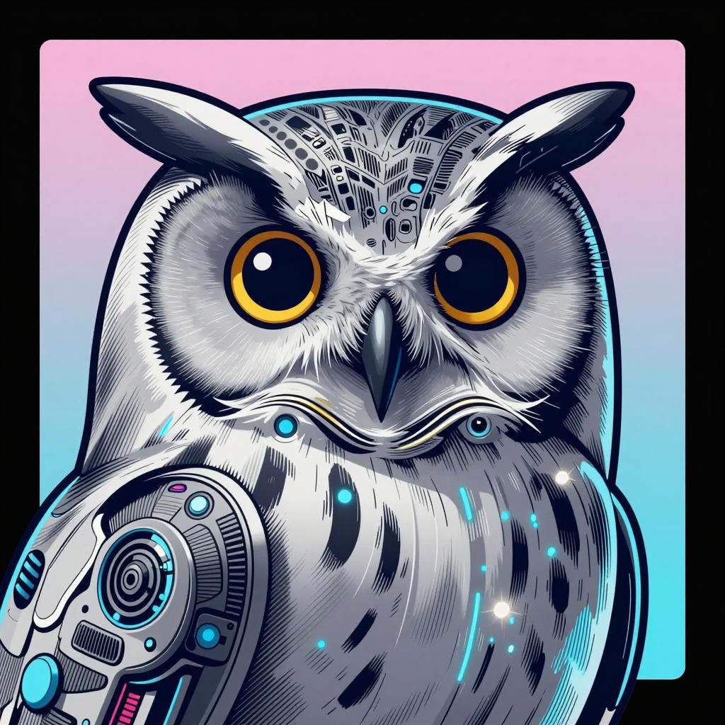 Extreme close-up macro shot of a futuristic cybernetic owl in a synthwave-retro blend, rendered with electric blue spectral highlights, vector-sticker simplicity, pastel gradient backdrop, graffiti accents, golden-ratio composition, detailed comics inking, crisp line art, ultra-high-res 8K, intricate textures, black background, no watermark.