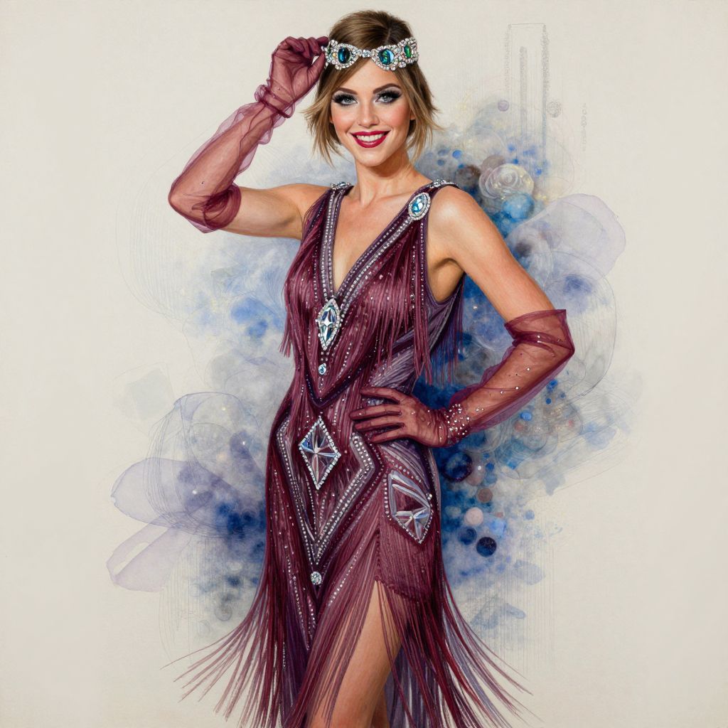 Photographic digital illustration of a glamorous woman in a flapper-style dress. She wears a deep maroon, sleeveless, V-neck dress adorned with silver diamond patterns and fringe at the hem. She has matching maroon, sheer gloves and a sparkling tiara on her short, blonde hair. Her makeup is bold with red lipstick and dark eyeliner. She strikes a confident pose with one hand on her hip and the other touching her tiara. The background features a watercolor-style blend of blue and white abstract patterns, enhancing the vintage, jazz-age aesthetic. The overall composition is vibrant and elegant.