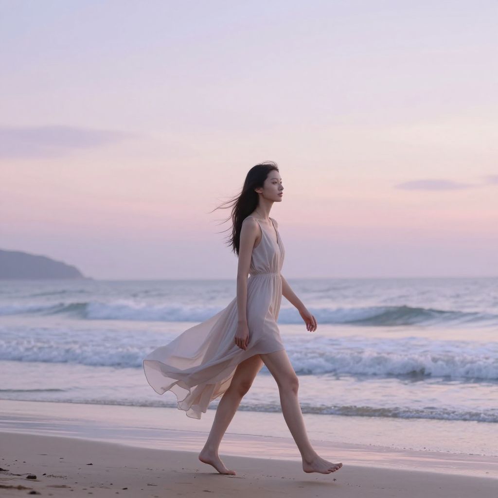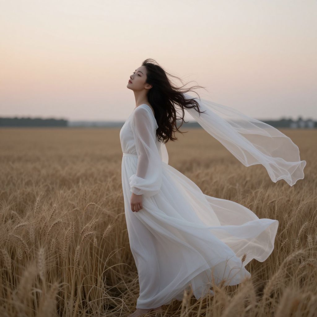 Ethereal winds swirl around a woman in a flowing white gown, her hair and sheer veil billowing gracefully as she stands amidst a golden wheat field under a soft twilight sky.