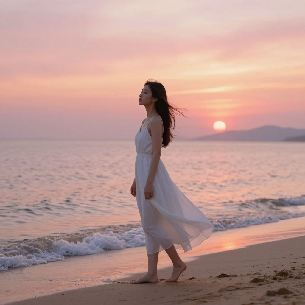 Photograph of a young woman with long, dark brown hair standing in a golden wheat field at sunset. She is wearing a flowing, sheer white dress with long sleeves, which billows in the gentle breeze. Her head is tilted back, eyes closed, and she appears to be enjoying the moment. The background shows a vast, open field with a gradient sky from pink to pale blue. Her dress and hair create soft, delicate contrasts against the golden wheat. The image exudes a sense of freedom and tranquility.