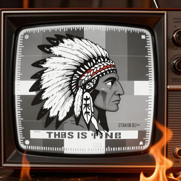A high-resolution image of a classic 1970s 'under maintenance' TV screen, The screen features a Native American head in a headdress, similar to the traditional test patterns used in that era, The test pattern includes various measurement marks, circles, lines, and geometric shapes, all in a grayscale color scheme, In the center, where it traditionally says \"PLEASE STAND BY, \" replace it with \"THIS IS FINE\" in a retro font, The overall design should evoke nostalgia, with an aesthetic that captures the look and feel of 1970s television screens, Additional elements like vintage TV knobs, dials, and a slightly worn texture can be added to enhance the nostalgic effect, flames are rising and flickering all around the tv