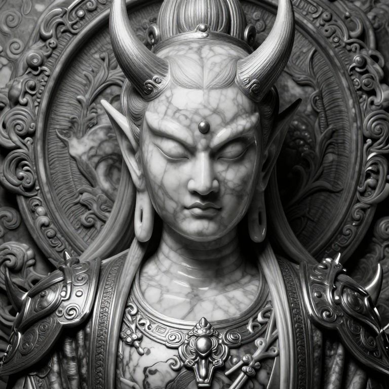 This is a highly detailed, monochromatic, black-and-white photograph of a Buddha statue with demonic features. The statue has a serene, closed-eyed face with pointed ears and prominent, curved horns on the forehead. The head is adorned with a small circular gem at the center of the forehead. The statue wears intricately designed armor with elaborate patterns and a large circular medallion in the background. The texture of the statue is smooth with subtle marbling, contrasting with the ornate, textured armor. The photograph emphasizes the contrast between the smooth face and the detailed armor, creating a striking visual effect.