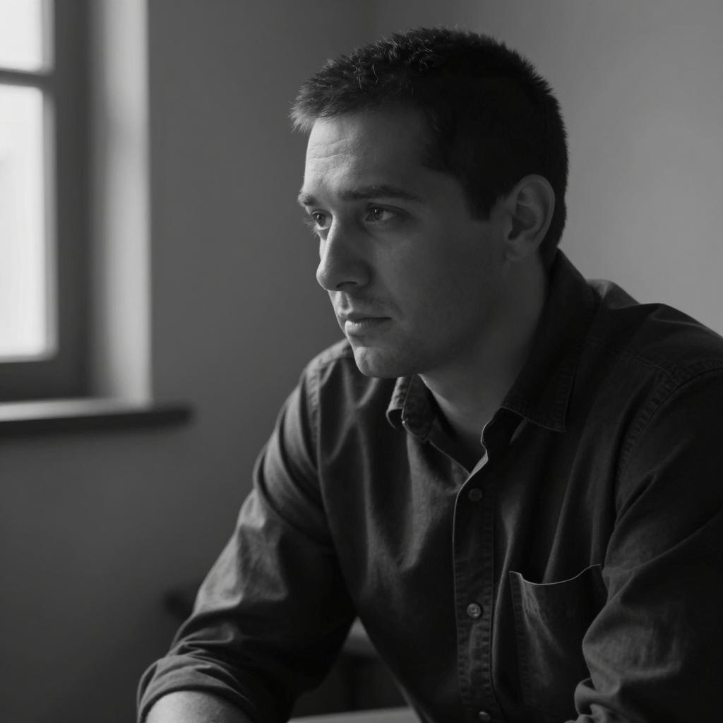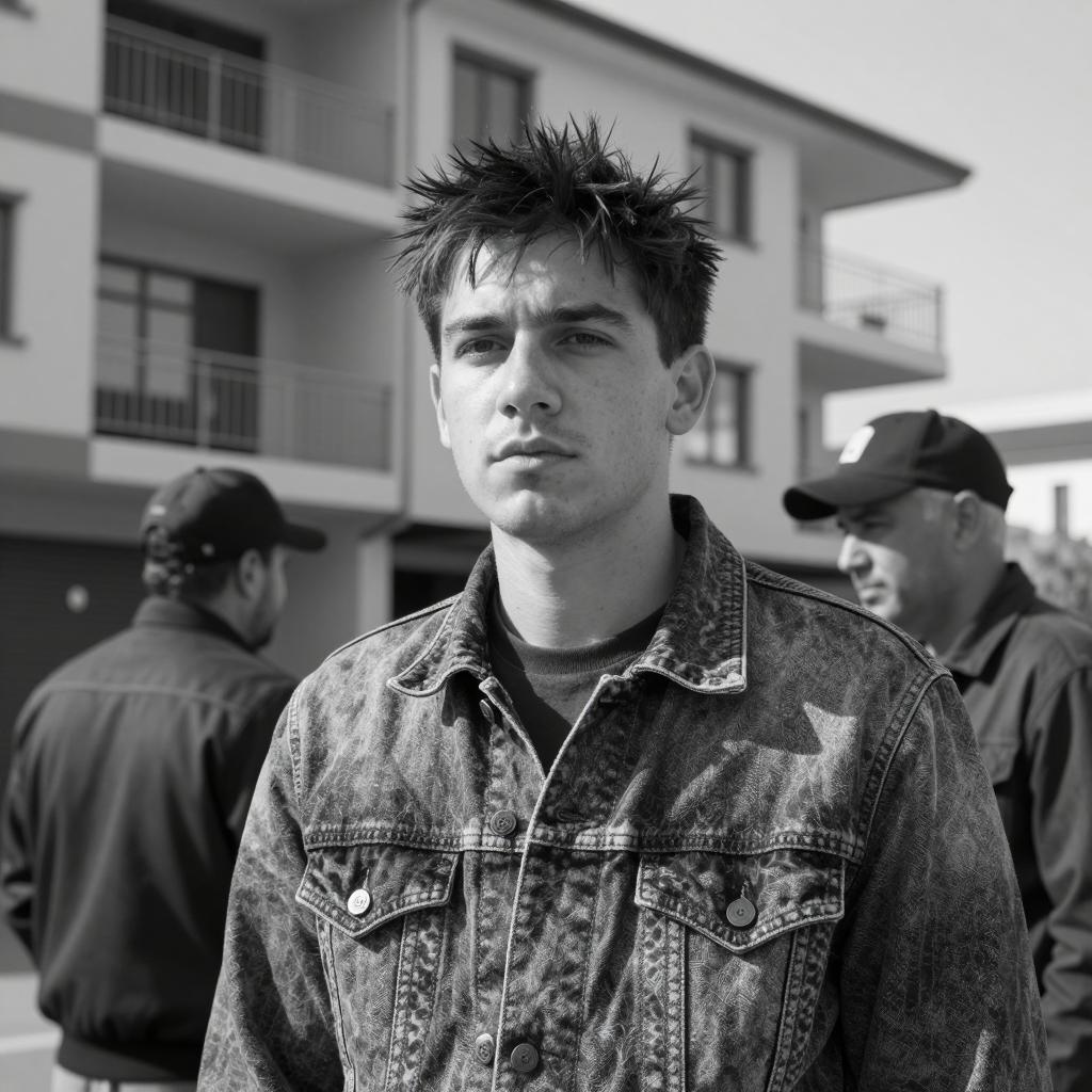 Black and white photograph of a man with short, messy hair, wearing a denim jacket, standing in front of a multi-story building with balconies. Two men with hats are in the background, one facing away, the other turned slightly. Daylight, outdoor setting.
