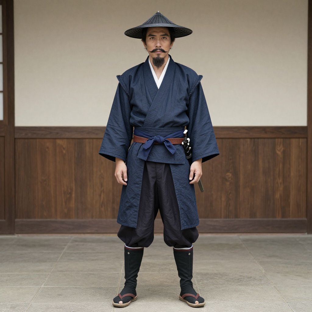 Photograph of a Japanese man standing in a traditional wooden room, wearing a dark blue kimono, wide-brimmed hat, black pants, and