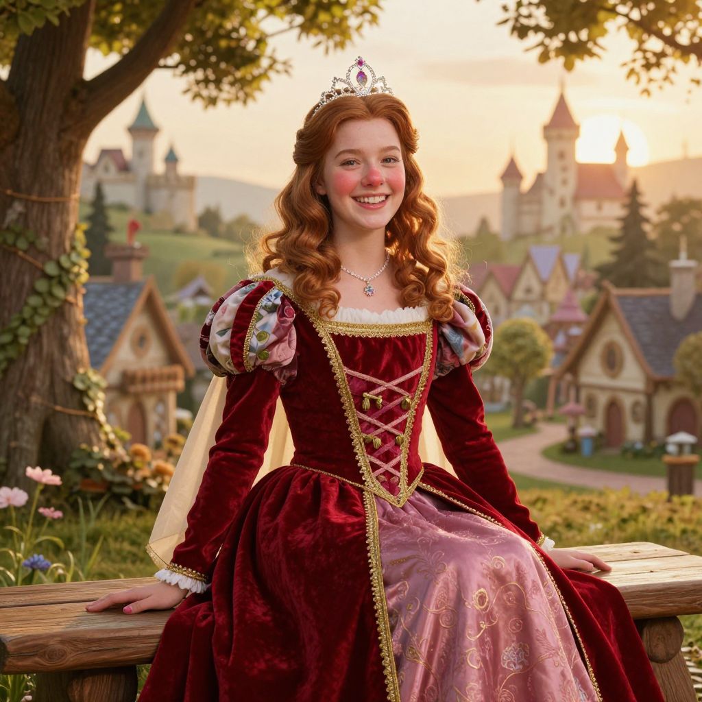 Photorealistic image of a tall, cheerful girl with a rosy nose, curly auburn hair, and a bright smile wearing the full Princess Belle costume—red velvet dress with gold trim, a floral shawl, and a magical tiara—sitting on a wooden bench in a fairy-tale village during a golden sunrise, trees and castles in the distance.