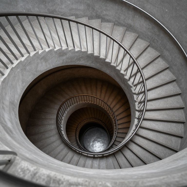 This photograph captures a close-up, top-down view of a spiraling stone staircase. The image showcases multiple circular layers of steps, each encircled by a metal railing. The steps are worn, with a rough texture, and the metal railings have a slightly weathered appearance. Light reflects off a polished, circular metal disc at the very center of the spiral, creating a bright spot amidst the otherwise muted, gray tones. The photograph emphasizes the geometric, repetitive pattern of the staircase, drawing the viewer's eye inward toward the center. The overall composition is symmetrical and hypnotic, highlighting architectural beauty.