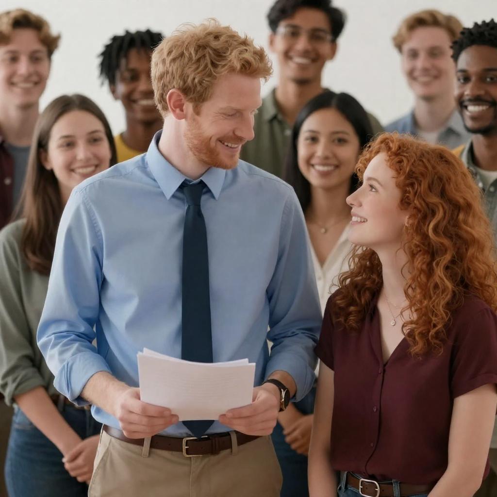 Photograph of a sunny outdoor scene with a young man in a gray striped shirt and black pants holding a blue sign reading "CELEBRATE!" standing and smiling at a young woman with curly brown hair, wearing a black and pink striped top, black pants, and a gray shoulder bag. Background includes blurred people and greenery.