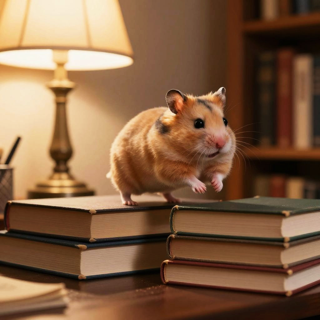 Hamster jumping from one stacked book to another in a cozy study room, warm tones, vintage lamp casting soft light, detailed shadows and textures, hyper-realistic art style
