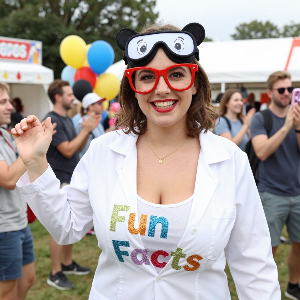 A lively 20-something woman in a ridiculous 'silly scientist' costume at a comedy festival, wearing a lab coat with 'Fun Facts' printed in glittery letters, a pair of goggles with goofy expressions, and big red glasses; her face is friendly and expressive with a mischievous grin; the setting is an outdoor festival with balloons, signs, and people clapping and cheering. The woman has big breasts and cute face