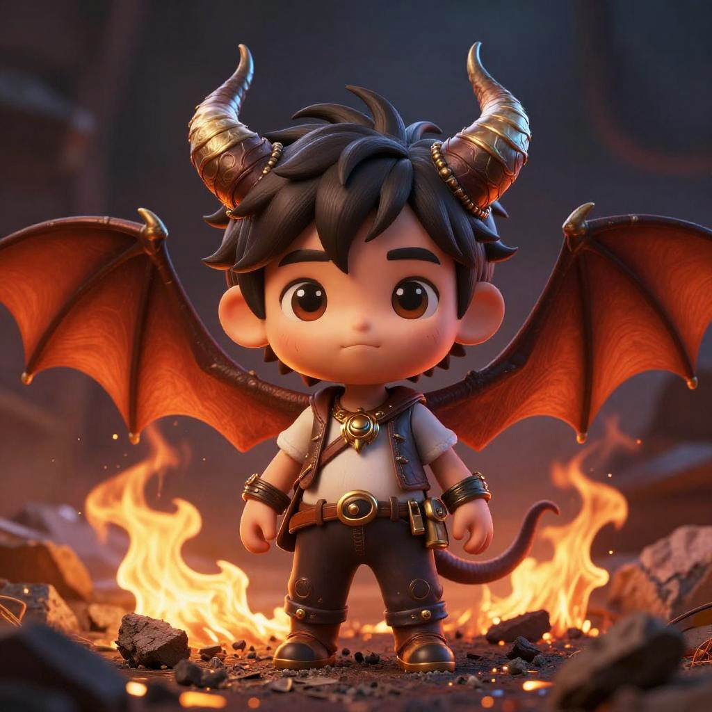 Tiny, (young, 19 years old), cute, masterpiece, high quality, HD, cinematic still, ((cell shading)), vivid colors, ambient lighting, ultra-detailed, illustration, colorful, best quality, highres, best shadow, best illumination, finely detail, 4k, (extremely detailed), (8k wallpaper), (best quality), hard lighting, (tracing), (intense shadows), nude, fire, ash, horns, bat wings