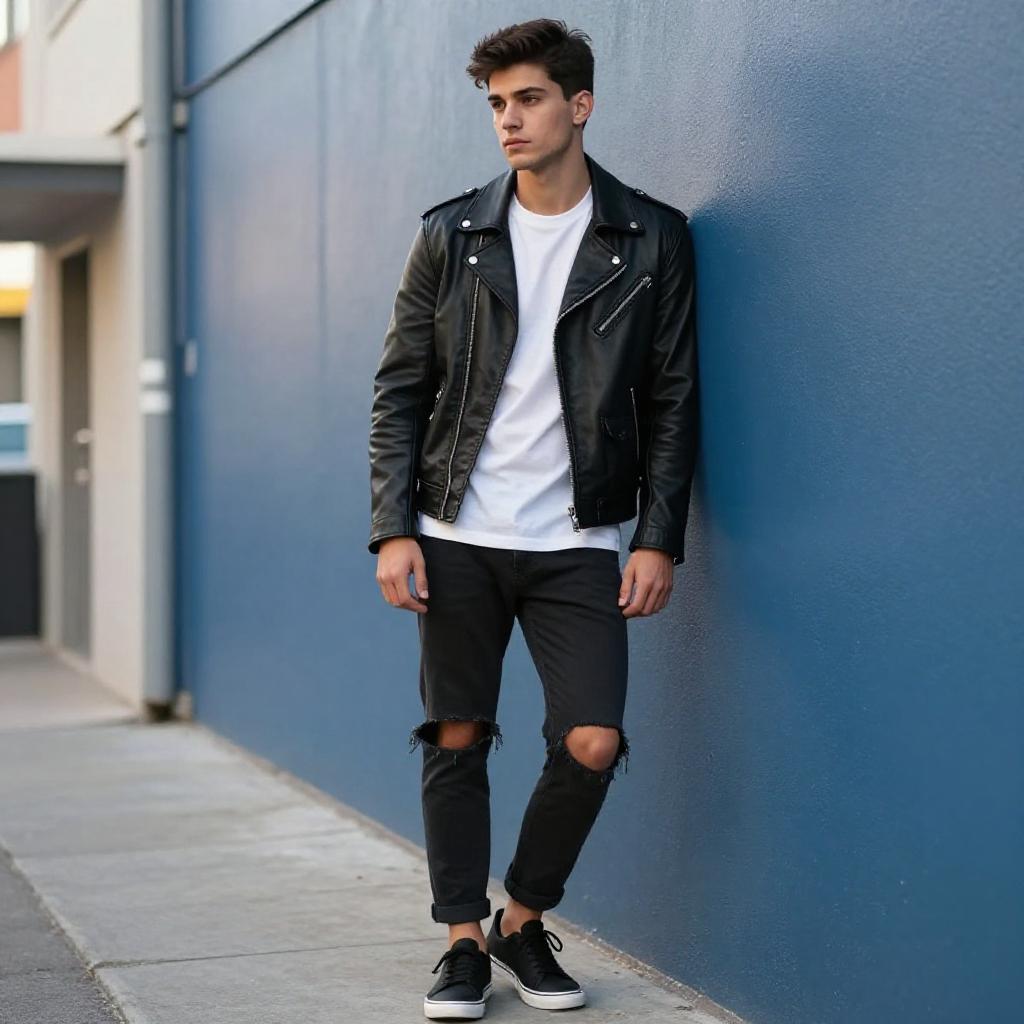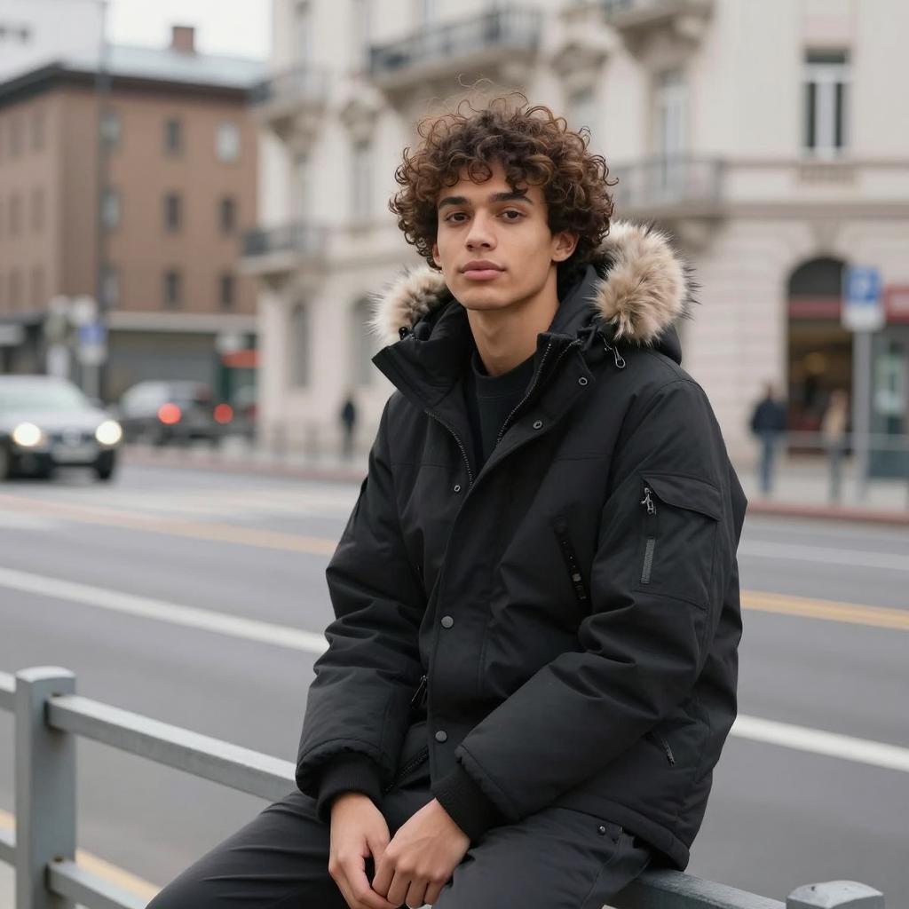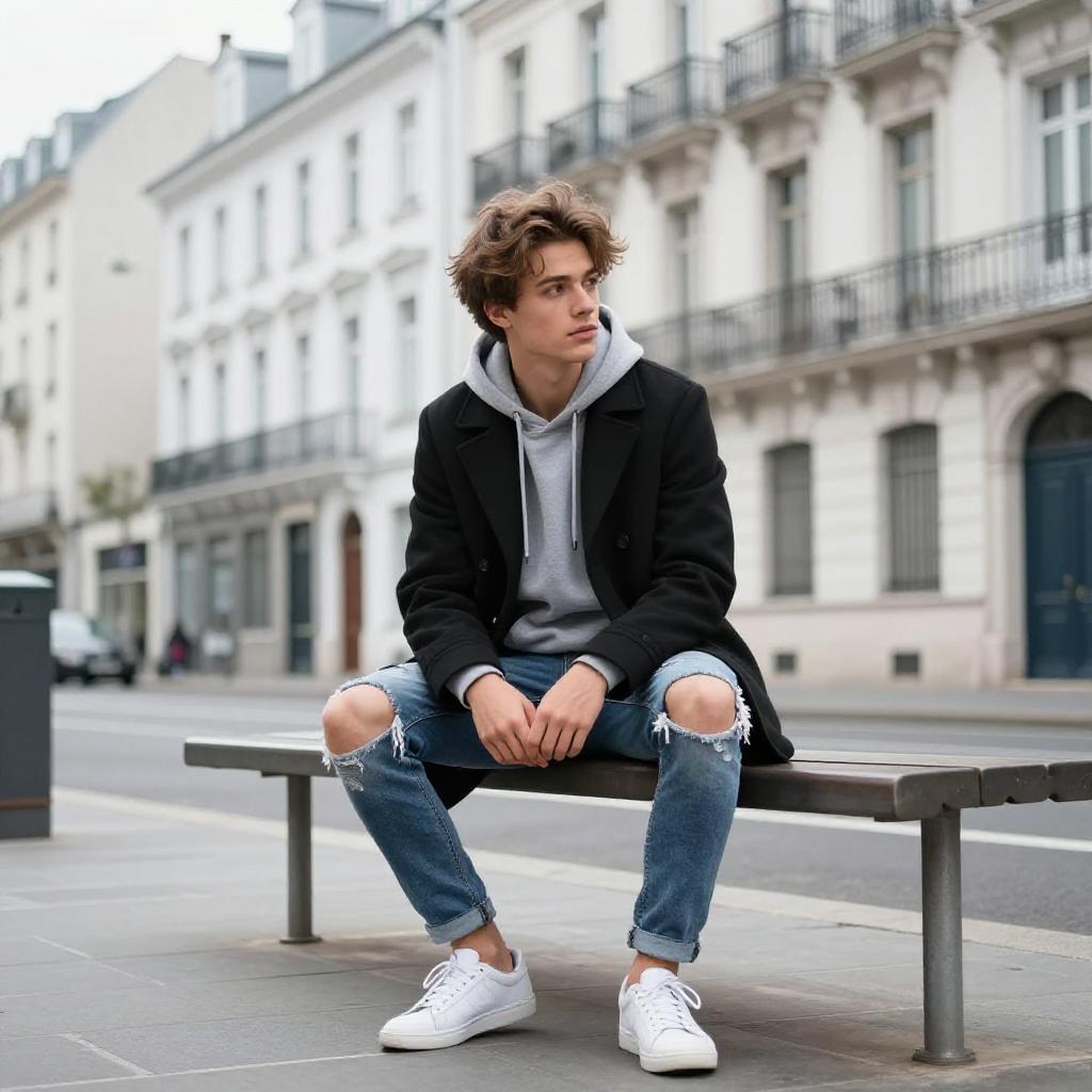 Photograph of a young, white man with tousled brown hair, sitting on a metal bench in an urban street. He's wearing a black coat over a gray hoodie, ripped blue jeans, and white sneakers. The background shows tall, white, historic buildings with black balconies, slightly blurred. The lighting is natural, with a slight overcast. Camera angle is eye-level, with a shallow depth of field.