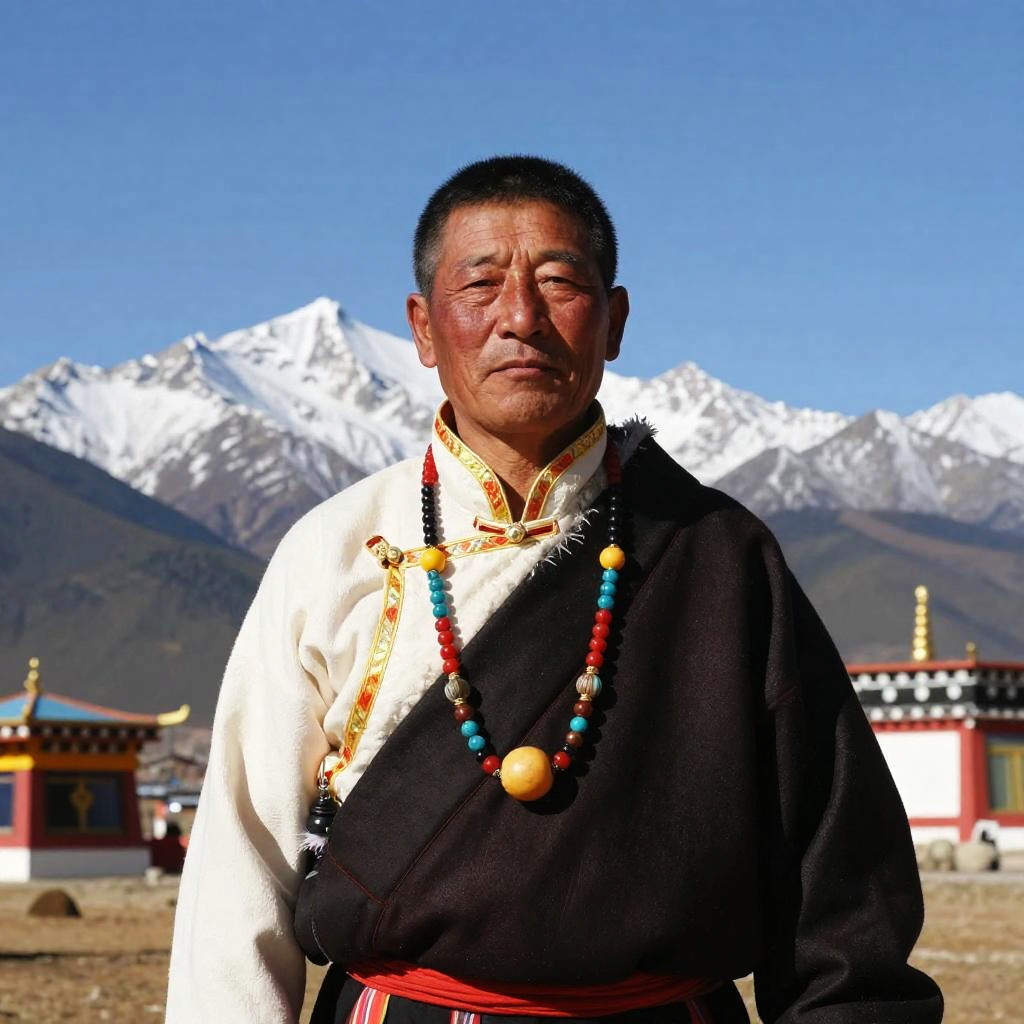 Photograph of an older Asian man with short black hair and a medium build, wearing a white and black traditional Tibetan outfit adorned with colorful bead necklaces. He stands in front of a stunning, snow-capped mountain under a clear blue sky. In the background, there are small buildings and a colorful structure. The man's expression is calm and slightly serious.