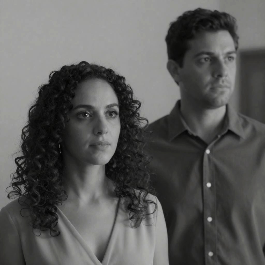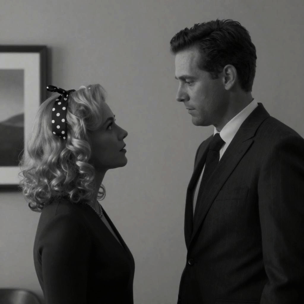 Black and white image showing a woman with short curly hair angrily screaming and grabbing the necktie of a man with dark wavy hair and a serious expression. The man is wearing a light-colored dress shirt. Both subjects are positioned against a textured rock wall background.