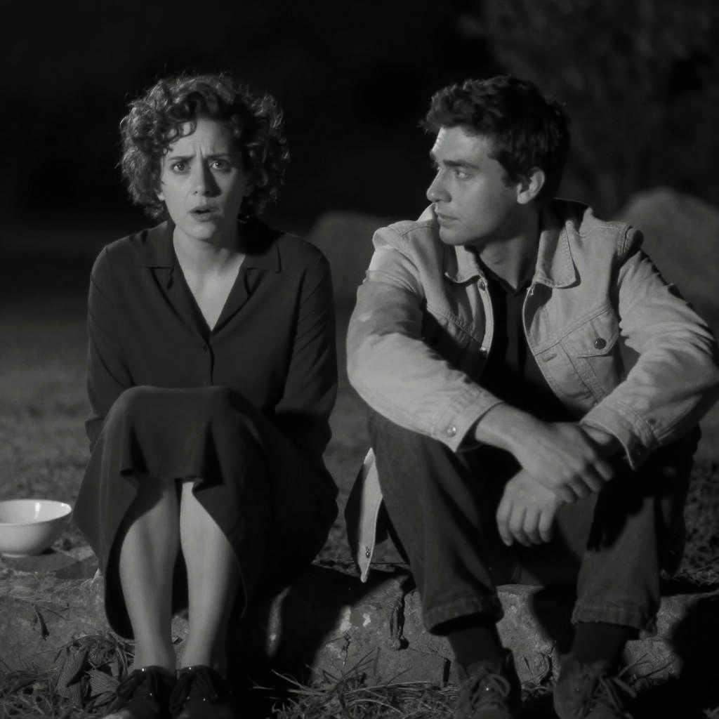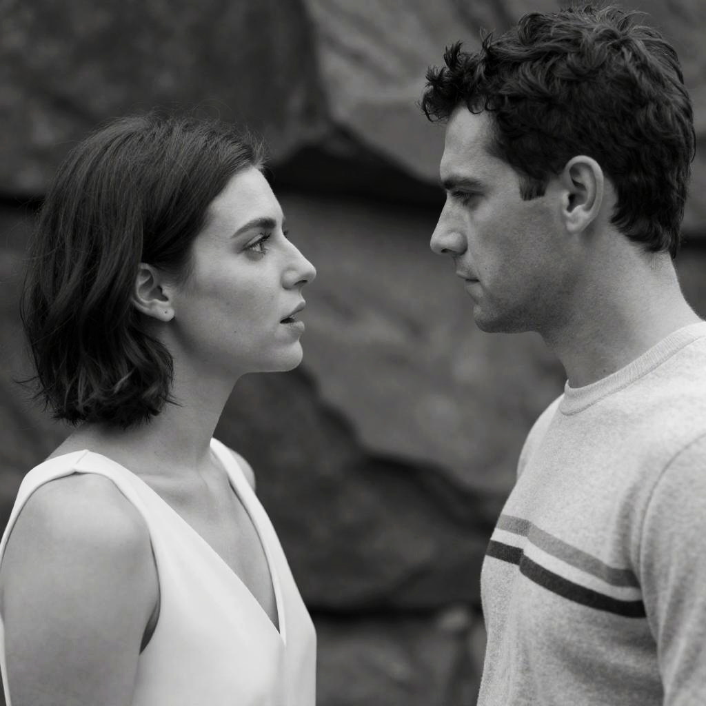 Black and white photograph of a man and woman against a ured rock wall. The woman has short, curly hair, open mouth in a scream, and grabs the man's necktie. The man has dark, wavy hair, serious expression, and wears a light-colored shirt. The woman is on the left, the man is on the right.