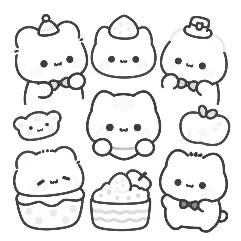 Cute kawaii chibi coloring pages filled with charming miniature animals and whimsical food items with exaggerated cute features, outlined in clean bold lines, inviting creativity with fun patterns and simple shapes ideal for coloring enthusiasts.