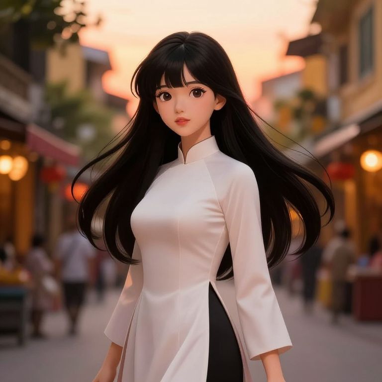 Vietnamese anime girl with long flowing black hair wearing a traditional áo dài dress, set against a vibrant Hanoi street backdrop at sunset, detailed art style with soft lighting and warm color palette.