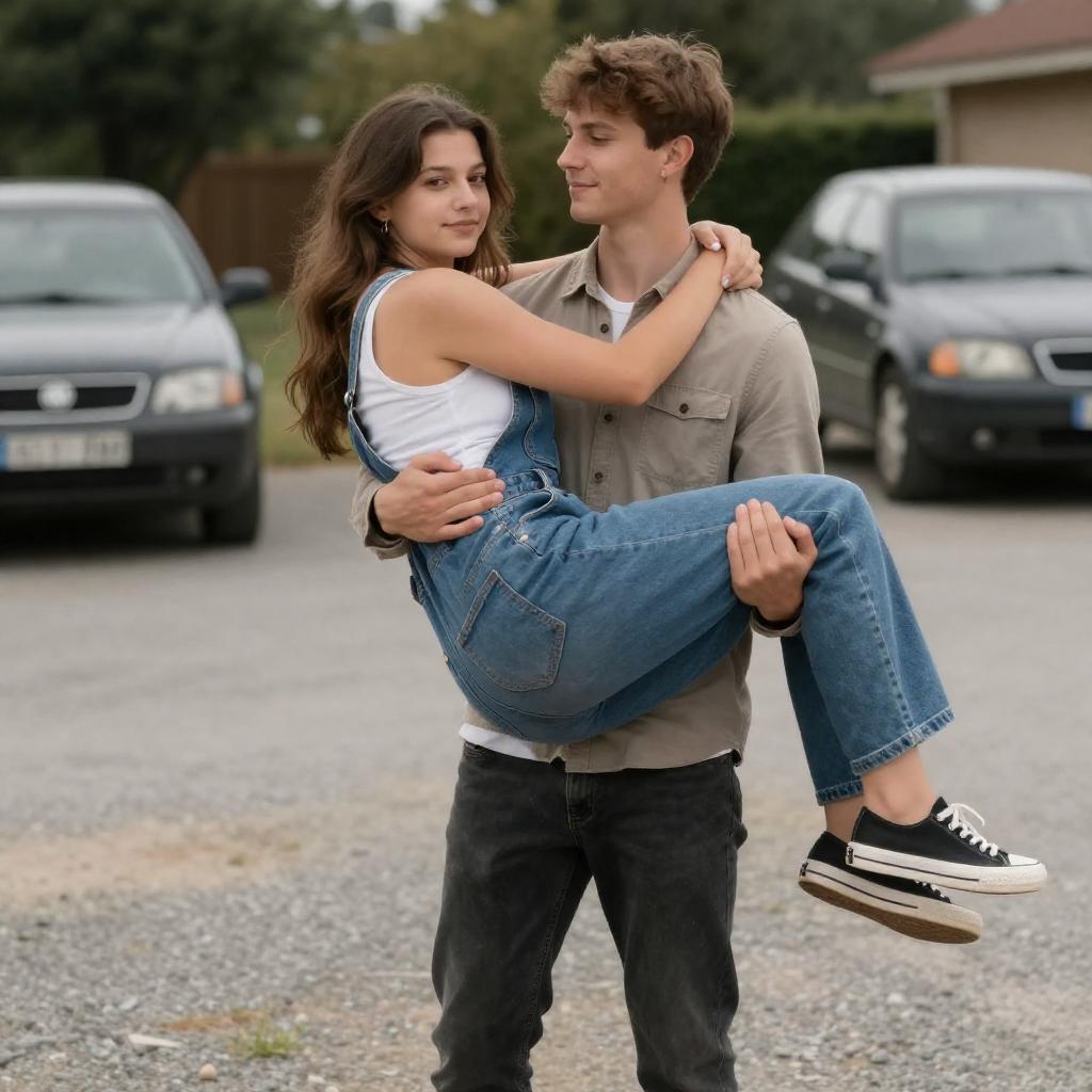 Photograph of a couple lying on a blue classic car. Woman in red sweater, black skirt, and black sneakers, embracing man in black t-shirt and blue jeans, also wearing black sneakers. Both smiling. Car hood in foreground, dark background. Man's left arm around woman's back, woman's right arm around man's chest. Woman's legs crossed over man's legs.