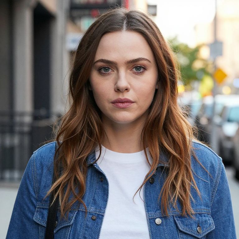 Kat Dennings casual chic look in an outdoor urban setting, natural lighting with slight golden hour glow, detailed facial features, vibrant but balanced colors, high detail portrait