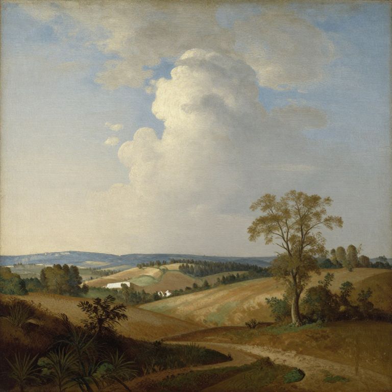 Baroque-style oil painting depicting a serene, rolling countryside with a large, fluffy cloud, distant hills, a solitary tree, and a small white farmhouse
