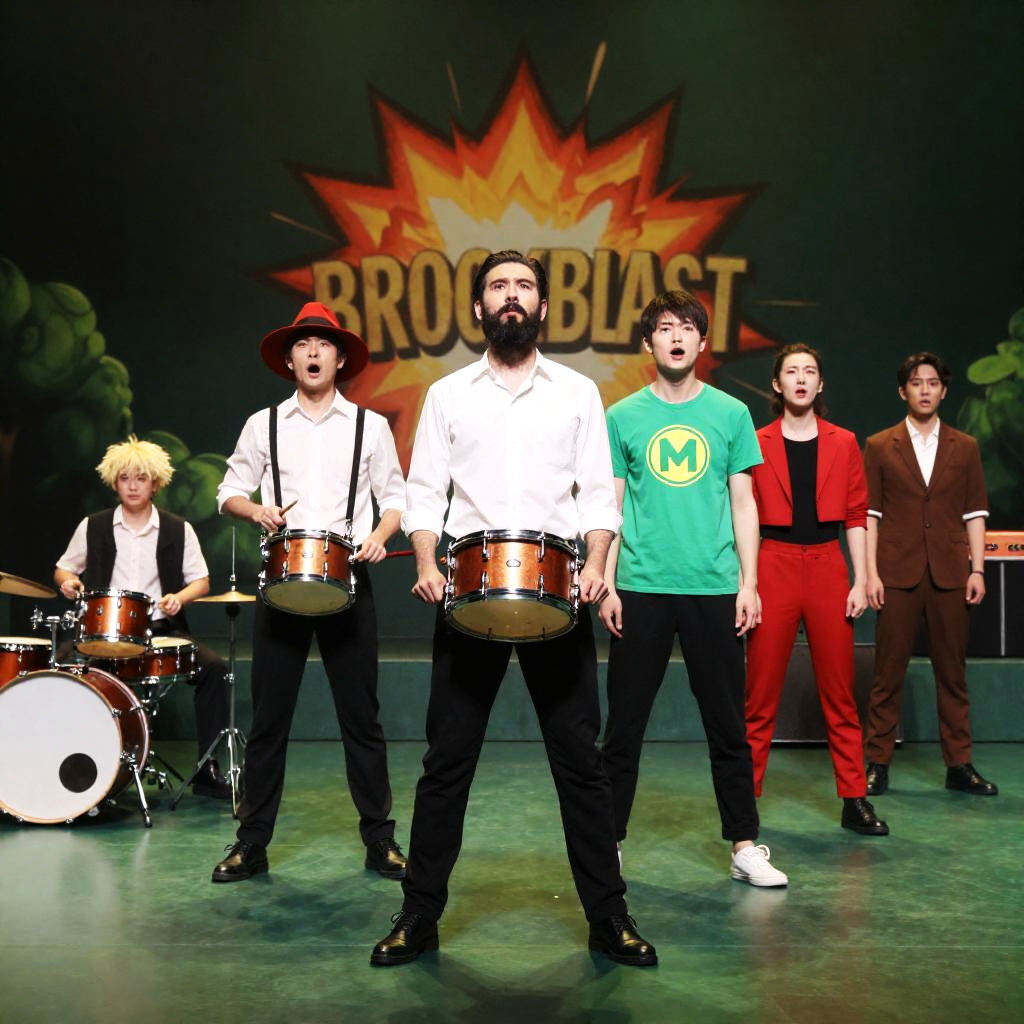Photograph of a stage with six costumed characters. Central characters include a drummer with a red hat, a bearded man with a white shirt, and a green-shirted character with an "M" emblem. Left: a drummer with a blonde wig. Right: a red-clad figure and a brown-costumed character. Background features a "Brock Blast" explosion graphic and green foliage. Stage has bright lighting, green carpet, and various musical instruments. Characters stand in a semi-circle, some with visible intense expressions.