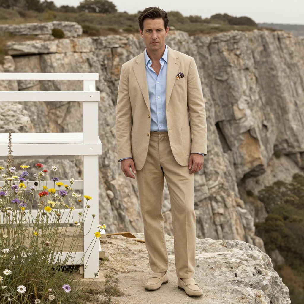 Photograph of a handsome Caucasian man with short, dark brown hair, standing on a rocky cliff. He is wearing a light beige suit with a light blue button-up shirt, no tie, and beige shoes. A small pocket square peeks from his jacket pocket. The background features a rugged cliff with gray and beige rock formations and a white fence to the left. Wildflowers in various colors, including yellow, purple, and white, are in the foreground. The man's expression is serious, and he stands with his hands relaxed by his sides. The sky is overcast.