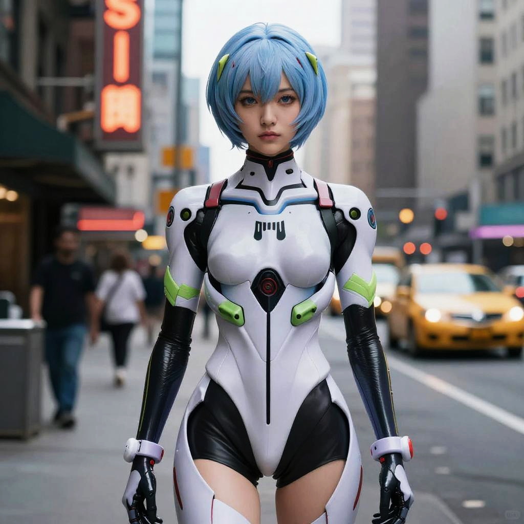 Cinematic still frame, world's most beautiful cyborg Ayanami rei in Evangelion, street fashion model, cyberpunk 2077 style new york street