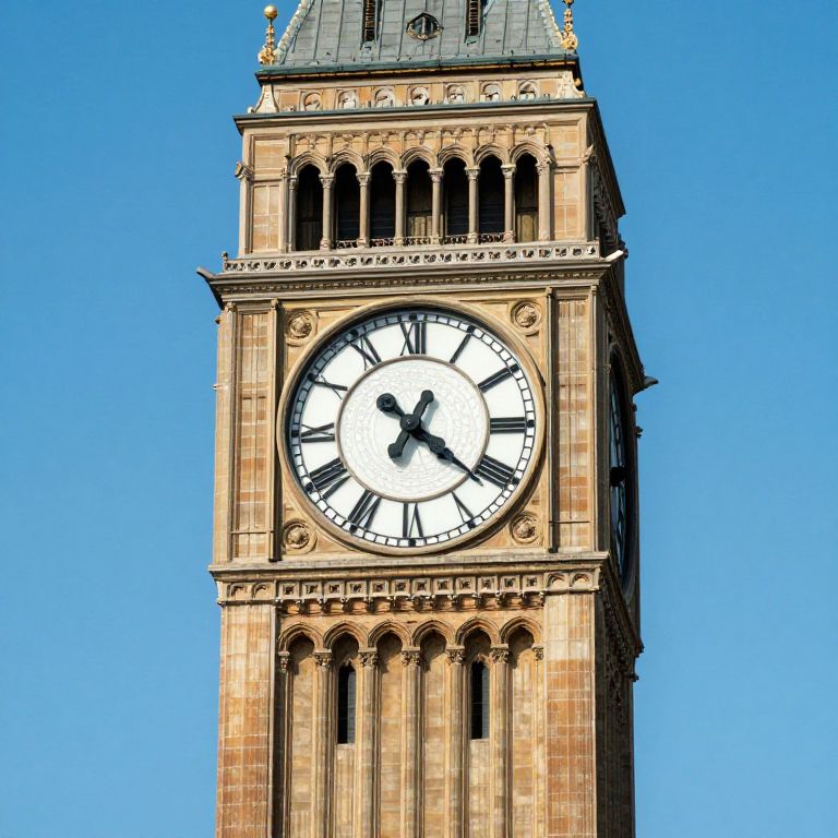 Photograph of a tall, beige stone clock tower with a large white clock face and black Roman numerals, set against a clear blue sky.