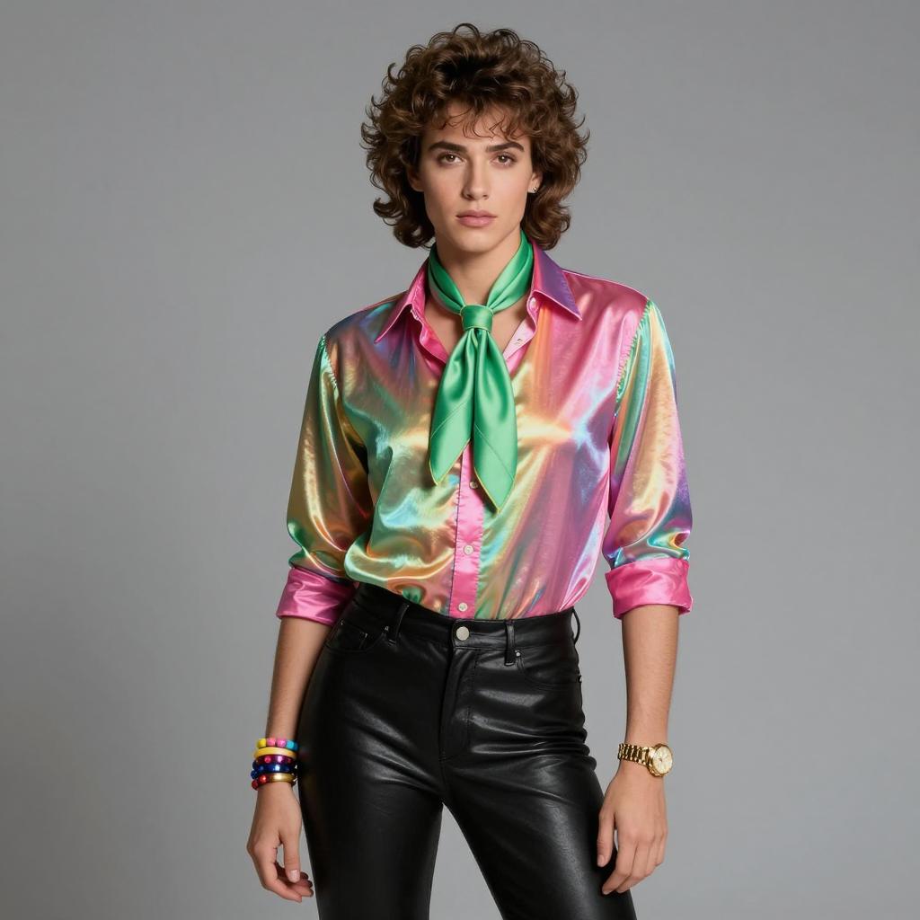 Photorealistic portrait of a young man with curly brown hair wearing a shiny rainbow-colored 1980s style shirt, a bright green scarf tied around the neck, black leather pants, multiple colorful bracelets on his right wrist, and a gold watch on his left wrist. The subject poses confidently against a neutral gray background with studio lighting highlighting slight neon color accents. The image has a symmetrical composition and soft shadows, styled as fashion photography.