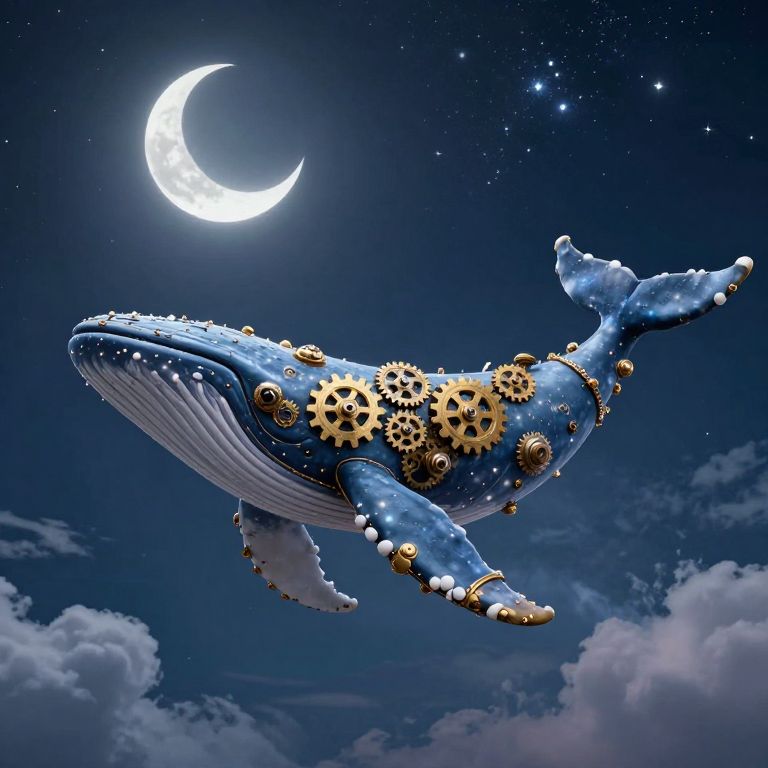 Digital artwork of a blue, mechanical whale with gold gears and cogs on its body, flying through a starry night sky. The whale's body has a glossy texture, with white speckles and metallic details. A bright crescent moon illuminates the dark blue sky, dotted with stars and fluffy white clouds below. The whale's fins and tail are adorned with small white lights, adding a magical, steampunk aesthetic to the surreal scene. The overall style is whimsical and fantastical, blending elements of science fiction and fantasy.