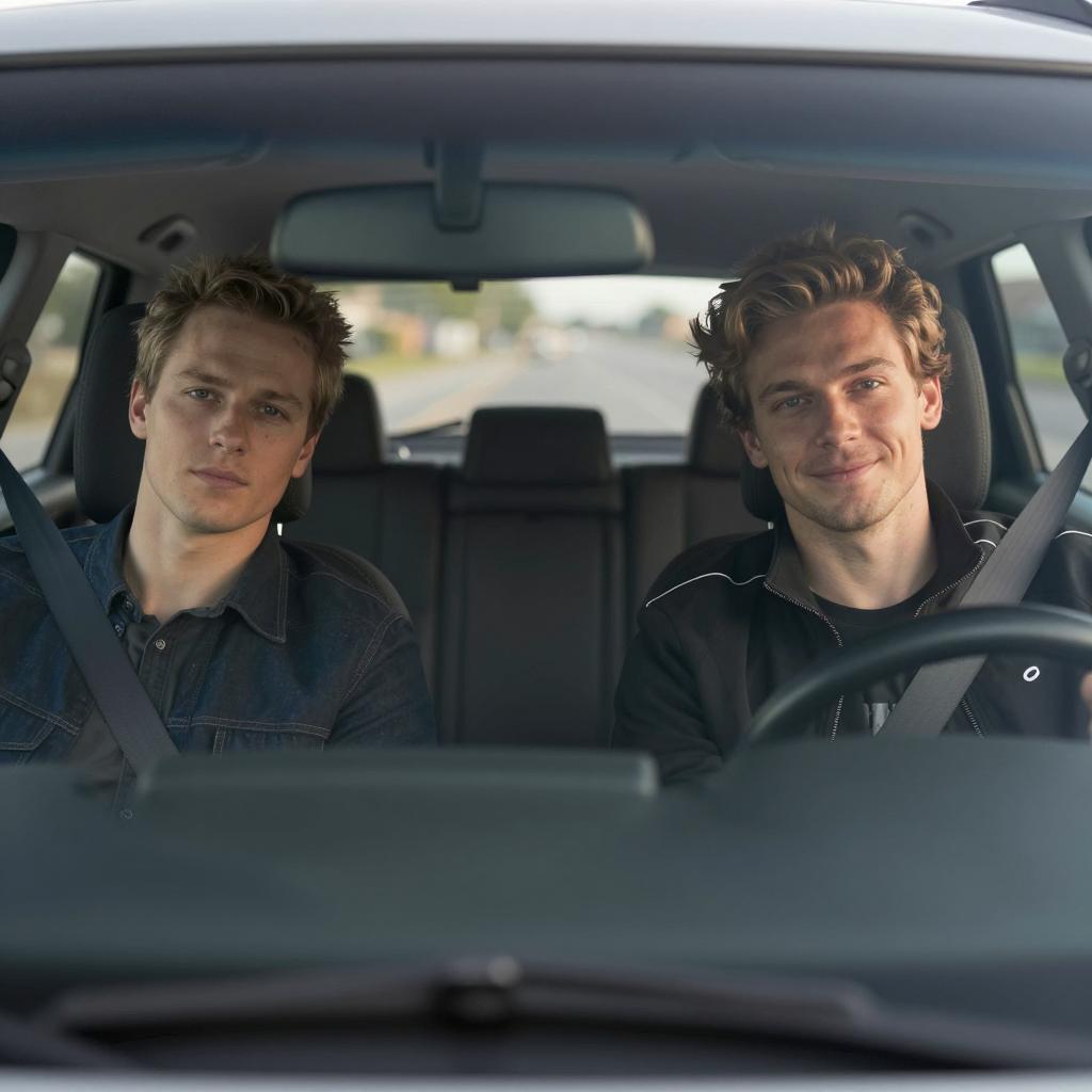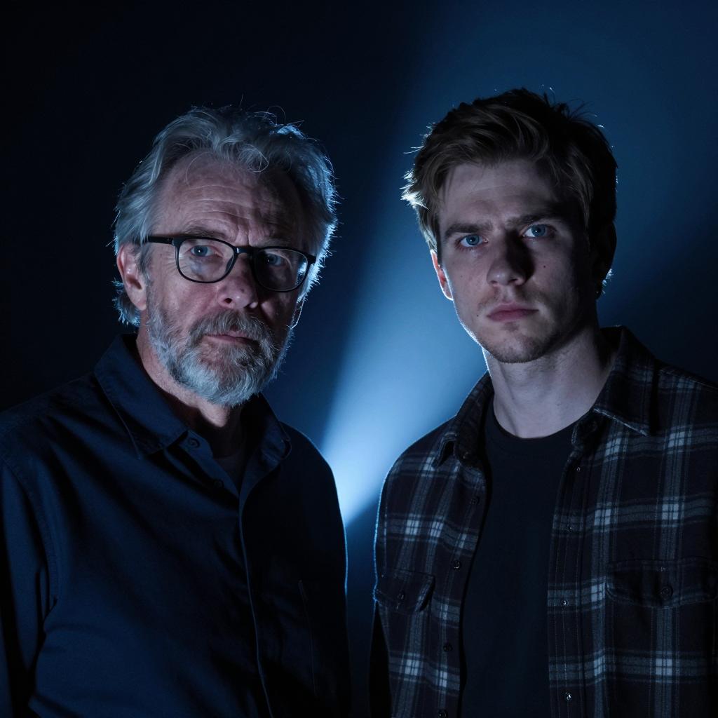 Close-up photograph of a white man with blue eyes and light stubble, focused expression. Background shows a blurred person with dark hair and glasses holding a phone to their ear. Dim blue lighting. One person in the foreground, one person in the background.