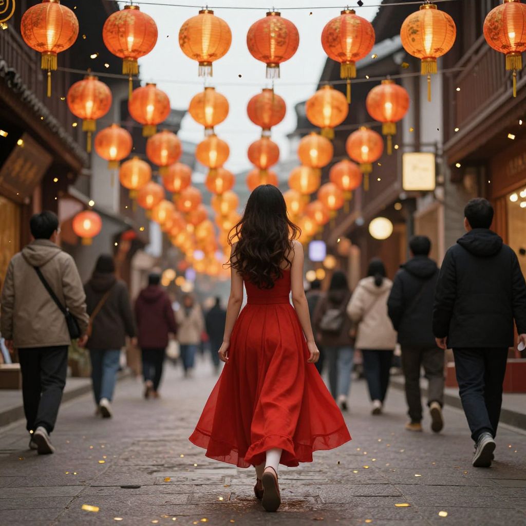 Photograph of a woman with long, wavy dark hair wearing a flowing red dress, walking away from the camera down a narrow, bustling street. She is flanked by people in casual clothing, including jackets and jeans. Above, numerous glowing red lanterns hang in rows, creating a warm, festive atmosphere. The street is lined with traditional buildings, and the sky is overcast, casting a subtle gray light. The ground is slightly wet, with scattered yellow petals. The scene evokes a sense of celebration and cultural richness.