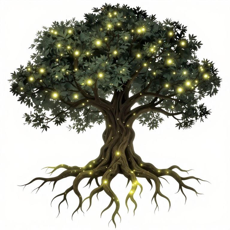 Digital illustration of a dark, leafy tree with glowing yellow fireflies scattered among its branches, set against a white background.