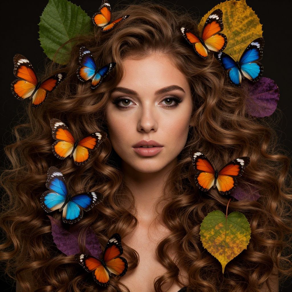 The image features a stunning light brown woman with long, curly hair that cascades down, adorned with vibrant butterflies and leaves. The butterflies, in shades of orange, blue, and black, flutter around her face and hair, creating a sense of movement and life. The leaves, in hues of green, yellow, and purple, are scattered throughout the scene, adding a touch of nature's beauty. The overall composition is rich in color and texture, with the butterflies and leaves creating a dynamic interplay of shapes and patterns. The woman's hair, with its intricate curls, frames her face, drawing attention to her expressive eyes and lips. The scene is a harmonious blend of natural elements and human beauty, capturing a moment of serene elegance.