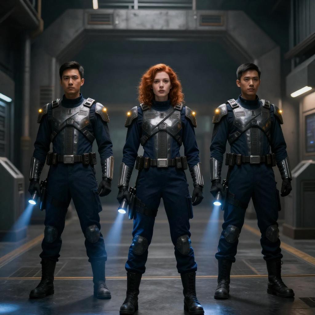 Photograph of three people in superhero costumes. Woman on left with black hair, gold headband, red strapless top, cleavage visible. Man in center with black mask, red and yellow suit, pointing. Man on right with black mask, grey suit. Golden arches in background. All three have focused expressions.