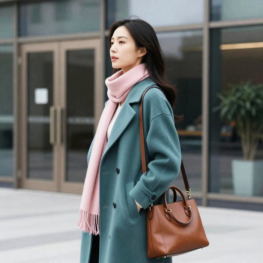 Asian woman with long dark hair, wearing a pink scarf and teal coat, carrying a brown leather bag, profile view, looking forward. Background: glass building with beige doors and plant. Urban setting.