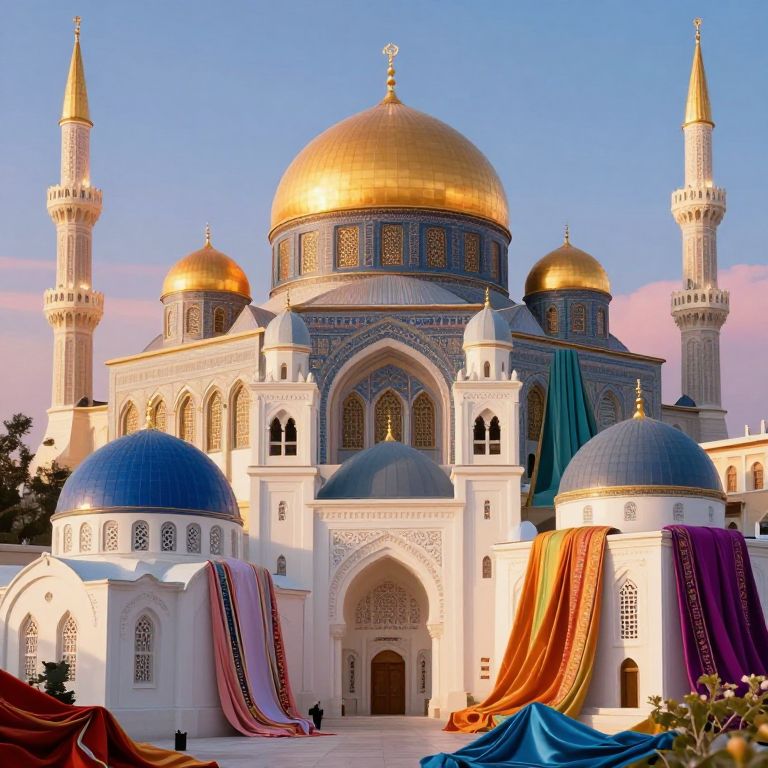 Photograph of a stunning Islamic mosque with golden domes, blue and white minarets, colorful draped fabrics, and intricate arches.