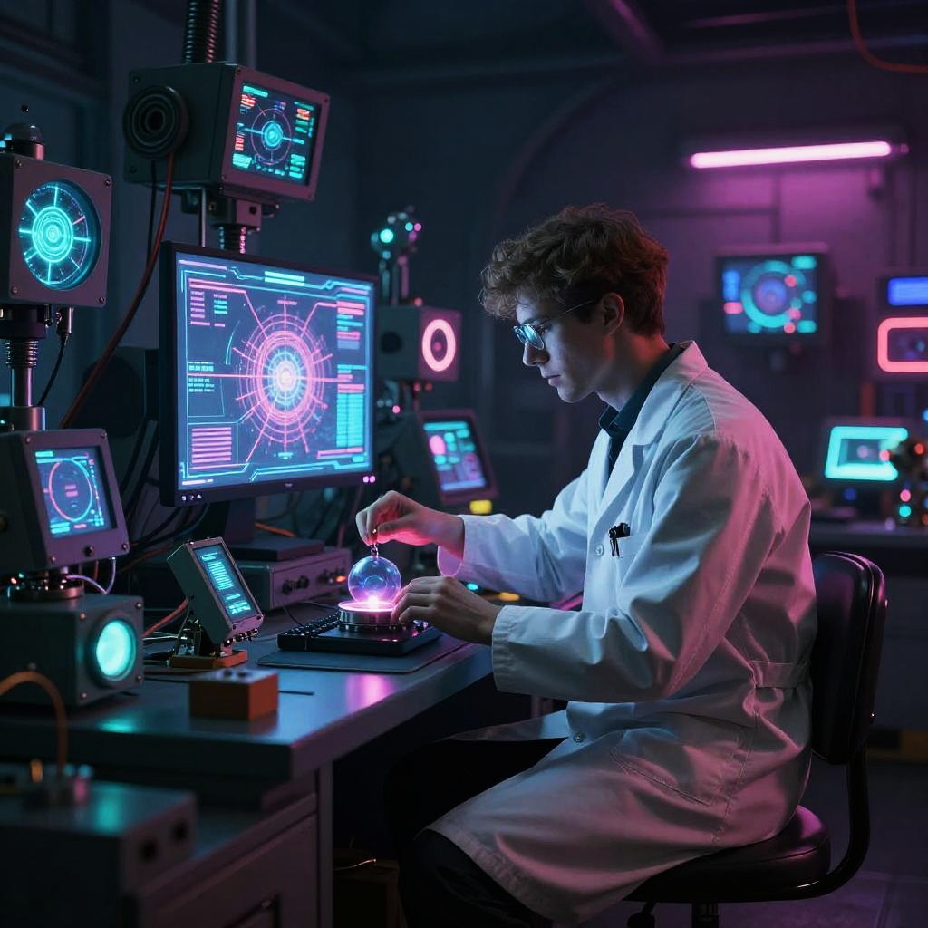 Herold cyberpunk underground lab filled with glowing devices, holograms, and cybernetic parts, a scientist working on a high-tech experiment, vibrant neon colors, dark and mysterious mood