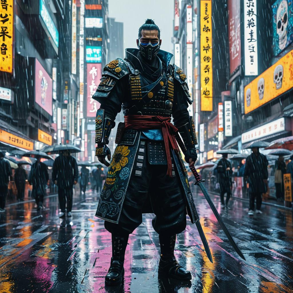 Glowing Cyberpunk Street Samurai in Neon Market