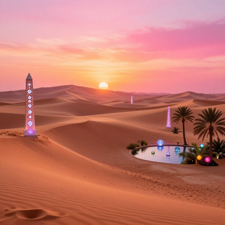 Beautiful fantasy landscape of a vast desert with towering sand dunes that sparkle like diamonds under a surreal pink and orange sunset, scattered ancient obelisks etched with glowing symbols, and a peaceful oasis surrounded by palm trees with luminescent fruits.