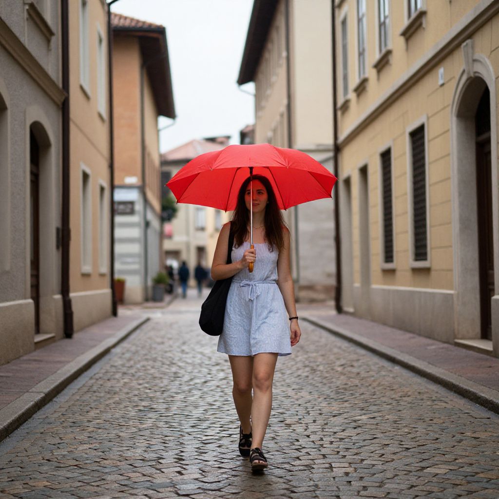 Woman with Red Umbrella on Cobblestone Street